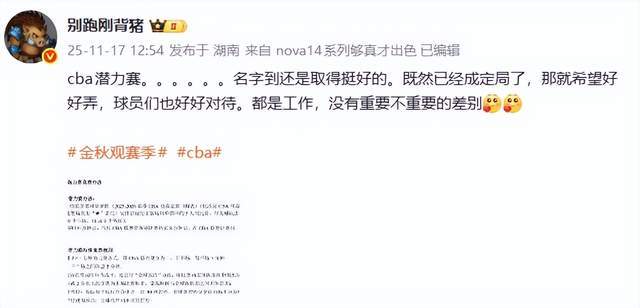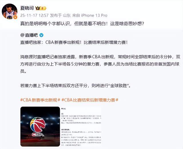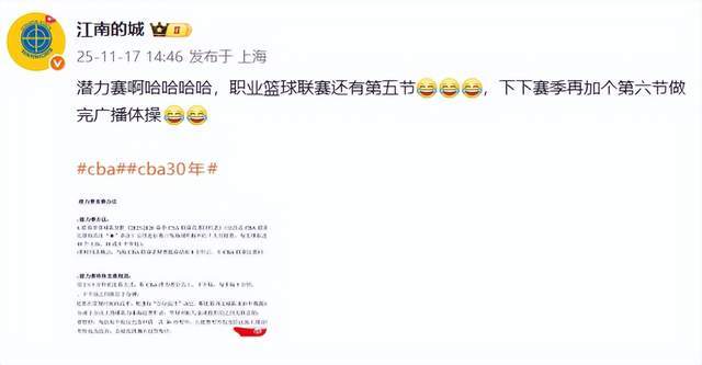 “江南的城”老師則連發(fā)2條動態(tài),表達(dá)了自己的質(zhì)疑,“潛力賽啊哈哈哈哈,職業(yè)籃球聯(lián)賽還有第五節(jié),下下賽季再加個第六節(jié)做完廣播體操。”