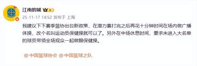 隨后,他又發(fā)了一條,“我建議下下賽季籃協(xié)出臺新政策,在潛力賽打完之后再花十分鐘時間在場內(nèi)做廣播體操,改個名叫運動員保健操就可以了。另外在中場休息時間,要求未進(jìn)入大名單的球員帶領(lǐng)全場觀眾一起做眼保健操。”