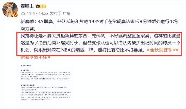 廣東媒體人麥穗豐老師則表示,“我覺得還是不要太抗拒新鮮的東西,先試試,不好就調(diào)整甚至取消。這樣的比賽當(dāng)然是為了給贊助商補(bǔ)曝光時長,但各支球隊也可以給隊內(nèi)缺少出場時間的球員一個機(jī)會。就跟楊瀚森在NBA的境遇一樣,能打比賽總比不打要強(qiáng)。”