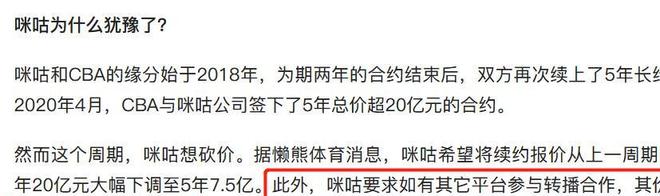 太往前的不說,就說上一次咪咕跟CBA簽的合同,那可是足足20億。