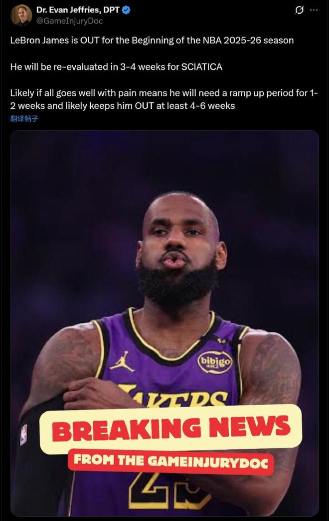 詹姆斯坐骨神經(jīng)痛進展:湖人計劃讓他11月中旬復出將耐心康復