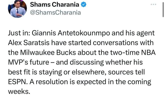 同樣來自爆料王Shams的消息源,倘若字母哥申請(qǐng)交易,涉及的球隊(duì)將遠(yuǎn)不止紐約尼克斯。薪資專家Marks對(duì)此表示,其余29支球隊(duì)都會(huì)跟雄鹿打電話詢價(jià)字母哥。