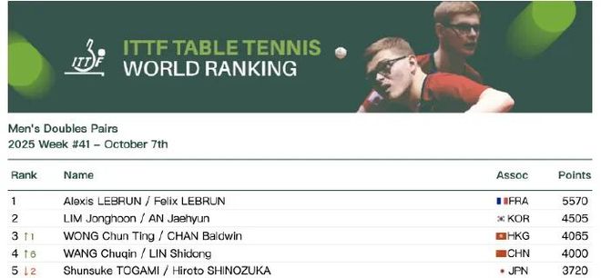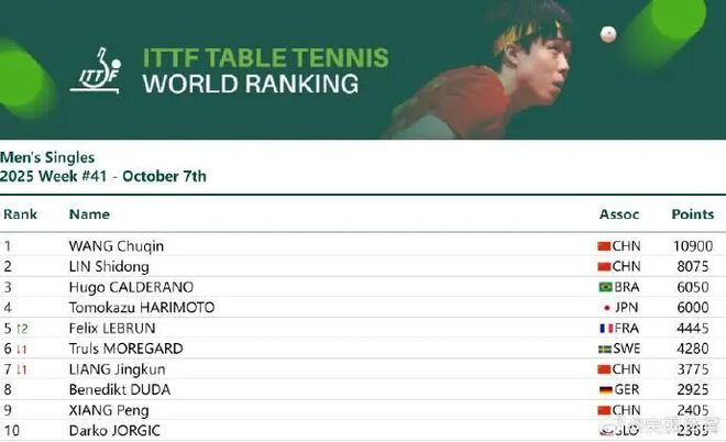 據(jù)央視新聞10月7日消息,今天,國際乒聯(lián)公布2025年第41周世界排名。