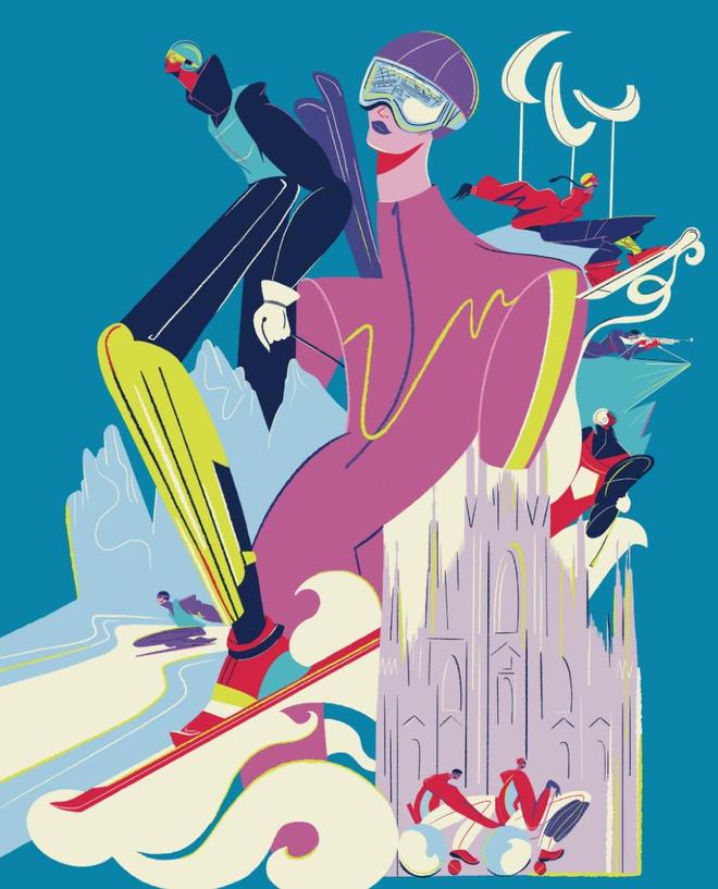Zagnoli創(chuàng)作了色彩鮮艷的“奧運愿景”海報,海報中央的人物透過奧運五環(huán)造型的眼鏡,以白色山峰為背景,凝視著前方。Zagnoli表示,她的海報既捕捉了家鄉(xiāng)米蘭的時尚感,也體現(xiàn)了科爾蒂納的山地風情,同時也歌頌了觀眾和運動員。