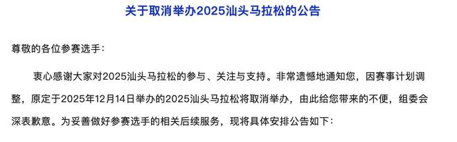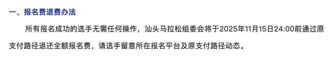 公告顯示,因賽事取消,2025汕頭馬拉松組委會將全面啟動報名費退還及交通、住宿退訂手續(xù)費補償工作,全力保障已報名選手的權(quán)益。