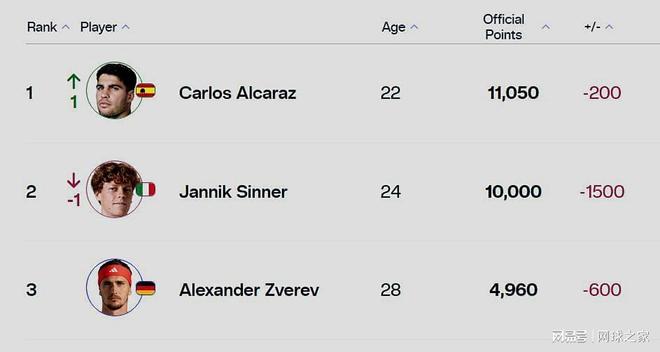而辛納則是被扣掉去年總決賽冠軍的1500個積分,世界一哥的寶座被西班牙紅星阿爾卡拉斯重新占據(jù)。當(dāng)然,辛納阿卡兩人關(guān)于年終排名世界第一的爭奪還沒有結(jié)束,但是阿卡無疑機(jī)會更大。