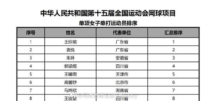 北京時間今日,全運(yùn)會官方公布了網(wǎng)球女單項目的運(yùn)動員排序,其中鄭欽文已經(jīng)不在名單之中,確認(rèn)退出本屆全運(yùn)會女單賽事。王欣瑜位列本屆賽事1號種子,她在首輪將會輪空。湖北省體育