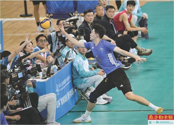 11月8日,排球男子成年組小組賽,上海隊(duì)球員卞世杰跑到場邊救球。