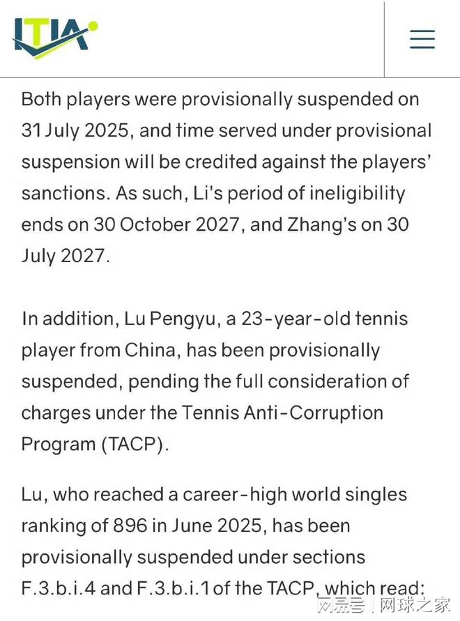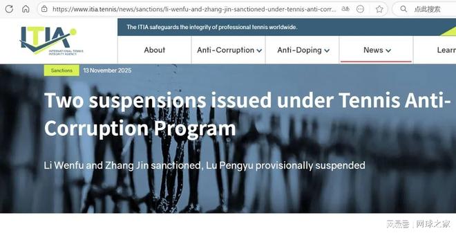 ITIA成員包括ATP、WTA、ITF、四大滿貫賽事主辦方等全球主要網(wǎng)球機構(gòu)。作為維護職業(yè)網(wǎng)球誠信的獨立機構(gòu),ITIA表示此類制裁旨在“推動并守護職業(yè)網(wǎng)球賽事的誠信”。