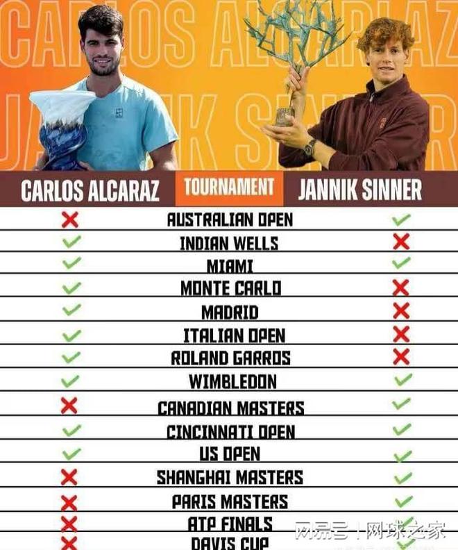 總的來看,阿卡在上半年的大賽表現(xiàn)要比下半年更好,而辛納則正好反過來了。還未曾奪得的大賽方面,除了奧運(yùn)會單打金牌外,阿卡缺了澳網(wǎng)、羅杰斯杯、上海大師賽、巴黎大師賽、年終總決賽以及戴維斯杯;辛納則沒有印第安維爾斯大師賽、紅土三大賽蒙特卡洛、馬德里和羅馬大師賽以及法網(wǎng)。