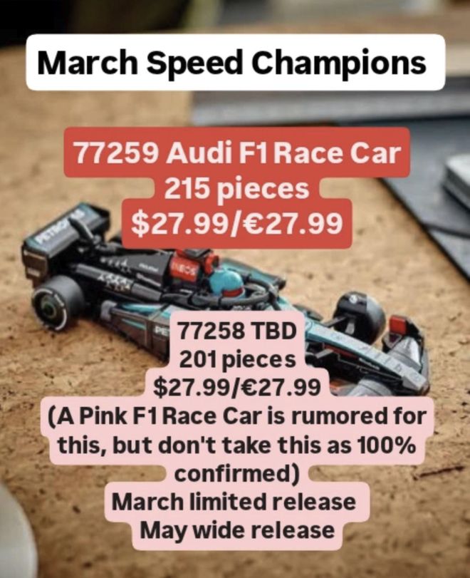 今天圈子為大家收集一下,最近幾天國外媒體Bricktap分享的最新樂高情報,目前已知的都是文字情報,可信度非常高,立刻看看:77259 Audi F1 Race Car已知套裝參數(shù):零件數(shù):215海外售價:27.