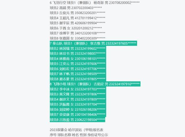 另據(jù)VICTOR官網(wǎng)當(dāng)年稍早前發(fā)布的信息,2023年5月13日-14日,2023 VICTOR 雙雄會(huì)哈爾濱站在哈爾濱市會(huì)展中心舉行。這次,“張吉惟”身為泰山隊(duì)球員兼領(lǐng)隊(duì),身份證號(hào)改成了232324197605******,其隊(duì)中另外7名球員分別為林國瑞、林玟書、林雅南、江奕云、劉柏宏、林子帆、夏志豪。