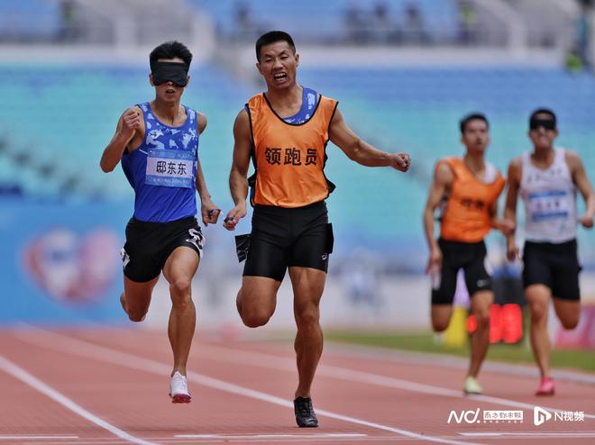 男子200米T11級(jí)決賽,第一名邸東東與領(lǐng)跑員一起沖過終點(diǎn)。