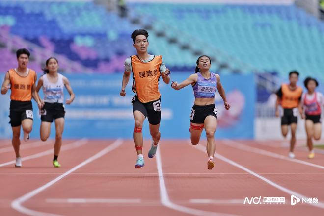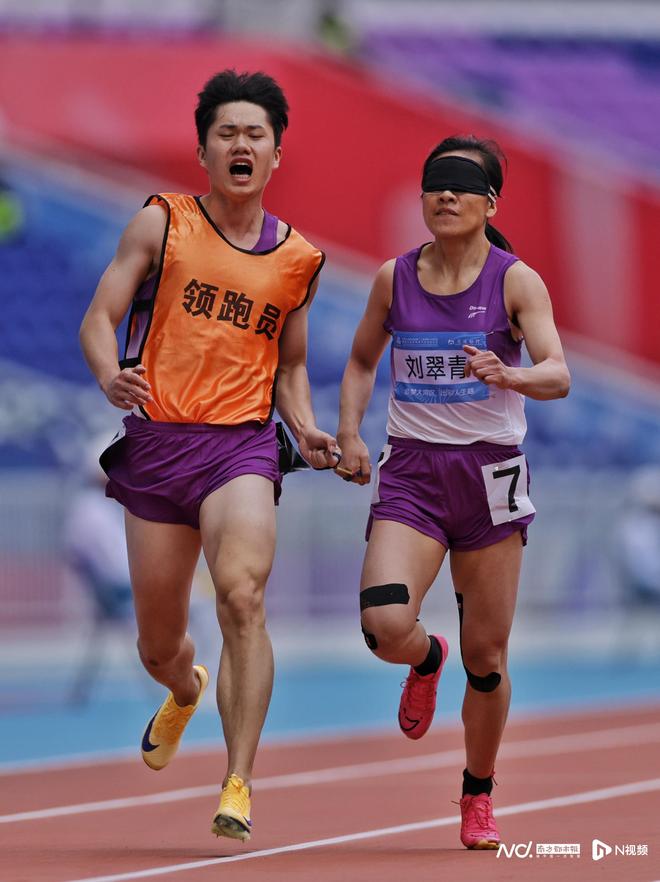 女子200米T12級(jí)決賽,廣東一團(tuán)梁燕芬與領(lǐng)跑員一起沖過終點(diǎn)一刻,她獲得該項(xiàng)目第一名。