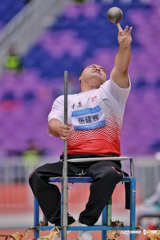 男子鉛球F57級(jí)決賽,重慶運(yùn)動(dòng)員張建輝奮力一擲。