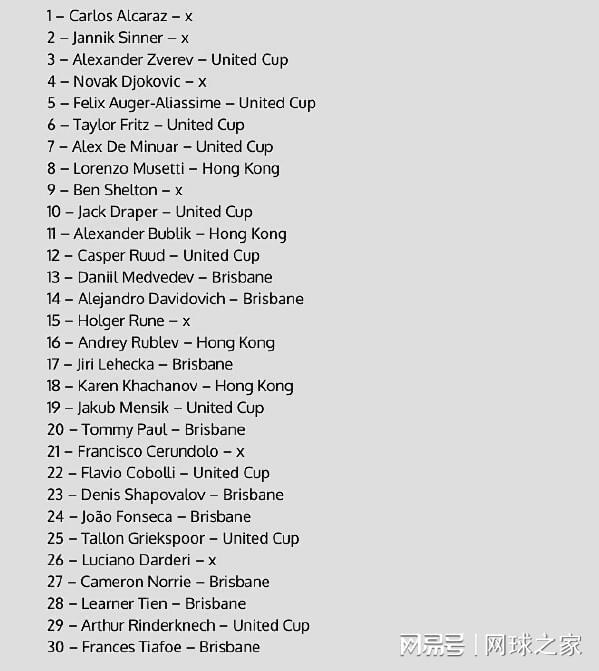 2026賽季再有不到三周就要拉開大幕了。那么新賽季的首周,ATP的高排位球員都有哪些賽程安排呢?有國外的球迷制作了一張表,把TOP30球員的賽程都列了進來,方便球友了解。在TOP30球員當(dāng)中,有23位球員選擇在新賽季首周就參加巡回賽的賽事,主要集中在聯(lián)合杯混合團體賽、ATP250布里斯班站和香港站。其他幾位球員,有因傷處于康復(fù)期的,有去打表演賽的,還有選擇不參賽的。