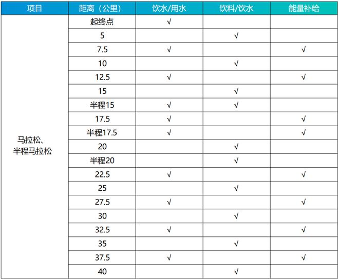 2.能量補(bǔ)給站:在比賽沿途的7.5公里、12.5公里、17.5公里、22.5公里、27.5公里、32.5公里、37.5公里以及半程和全程終點(diǎn)處設(shè)置能量補(bǔ)給站。