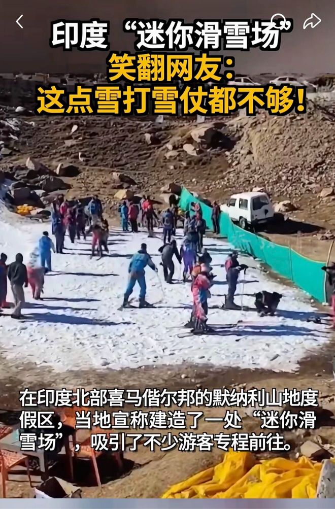 在一眾“避雷”帖里,有人幽默地翻出近期登上熱搜的印度滑雪場。在印度北部默納利,有商家打造了一個迷你滑雪場,實際體驗和宣傳相去甚遠(yuǎn)。所謂滑雪場面積不足200平米,四周是光禿禿的土坡,雪層薄到露出了黃土。而門票價格也不低,需要500盧比。
