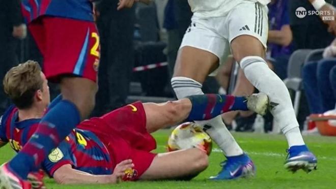第90+1分鐘,巴薩仍以3比2領(lǐng)先,比賽僅剩幾秒鐘即將結(jié)束。此時(shí),巴薩中場(chǎng)弗蘭基·德容對(duì)皇馬前鋒基利安·姆巴佩做出一次激烈鏟搶——他高抬腳底,鞋釘直接踢中姆巴佩的小腿部位。