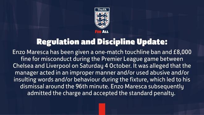 北京時(shí)間10月15日,英足總官方發(fā)布公告,公布了對(duì)馬雷斯卡的處罰措施,后者在對(duì)陣?yán)锲值谋荣愔斜患t牌罰出場(chǎng)外。