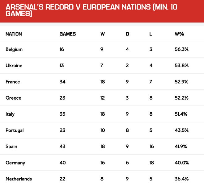 歐冠對西甲球隊(duì)6連勝后,阿森納對西甲球隊(duì)的勝率已經(jīng)超過40%,達(dá)到41.9%。如若此番擊敗馬競,阿森納將第19次擊敗來自西班牙的球隊(duì)。而西班牙也將正式成為阿森納取勝次數(shù)最多的聯(lián)賽國別。