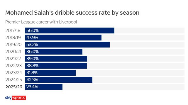 薩拉赫為什么無(wú)法頻頻過(guò)人了?卡拉格認(rèn)為薩拉赫體能下降,盡管聽(tīng)上去有些殘酷,但那個(gè)過(guò)人如麻的邊鋒已經(jīng)成了過(guò)去式。在本賽季,薩拉赫的突破成功率低于25%,這是其8年利物浦生涯第一次低于25%。