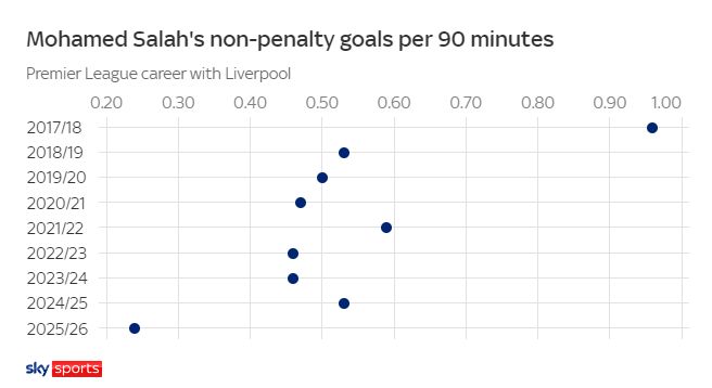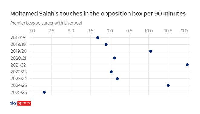 薩拉赫本賽季在對(duì)手禁區(qū)內(nèi)的場(chǎng)均觸球次數(shù)同樣下滑,而且又一次創(chuàng)造歷史新低。