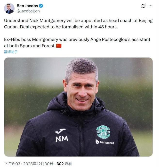 在此之前,記者雅各布斯也在社交媒體發(fā)文稱,尼克-蒙哥馬利將出任北京國安主帥,雙方預計將在48小時內(nèi)簽署正式協(xié)議。